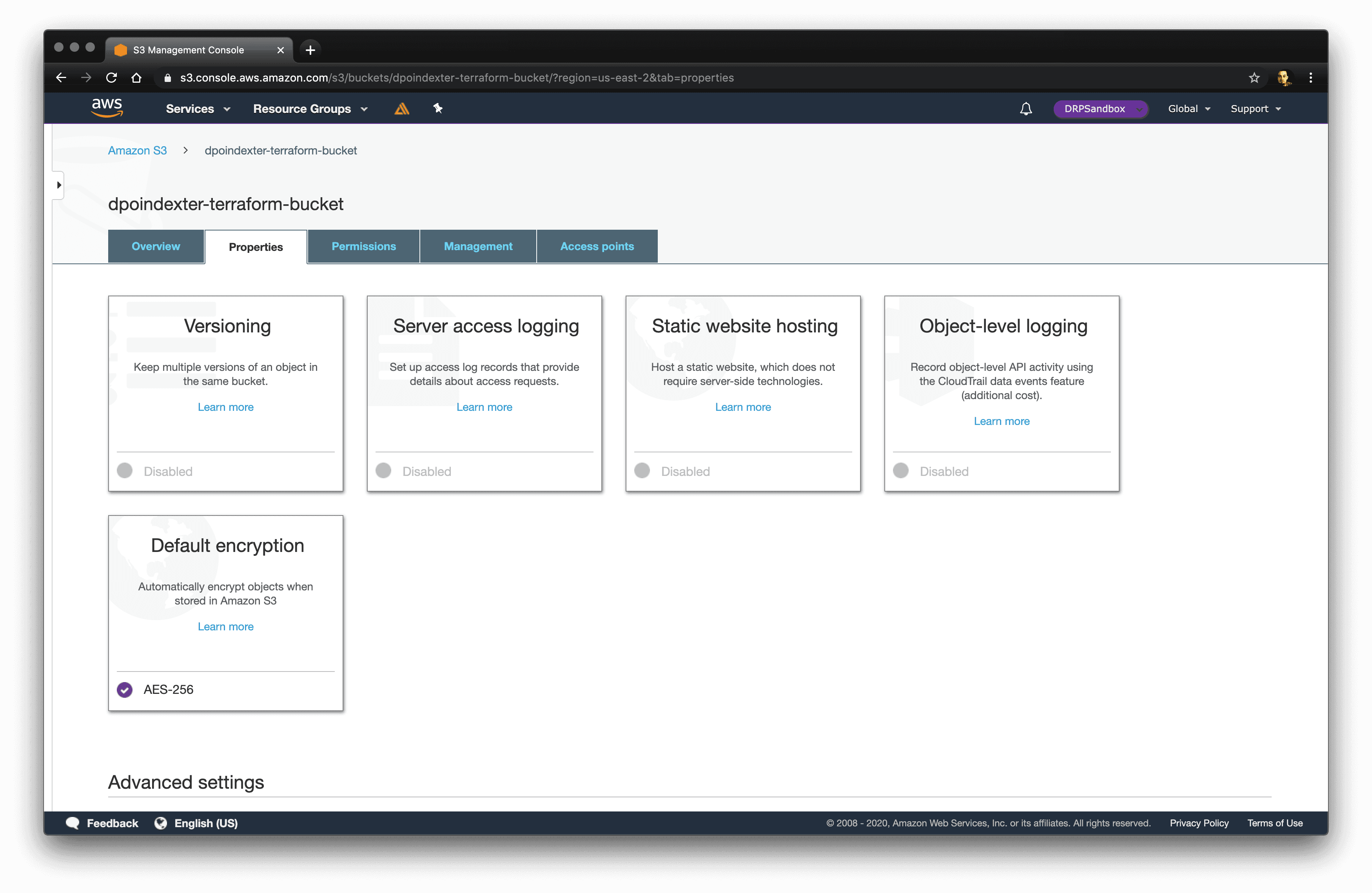So let's take a look. You should see the properties of the bucket have changed to reflect that Default Encryption AES-256 is now enabled.